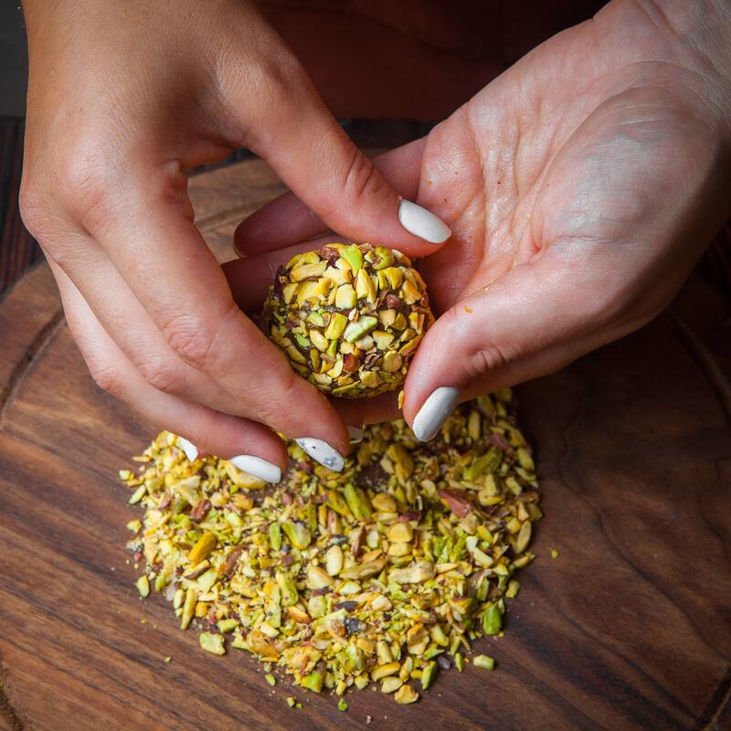 - Colocar las trufas sobre una tabla o charola y, como toque final, espolvorear pistache triturado por encima.