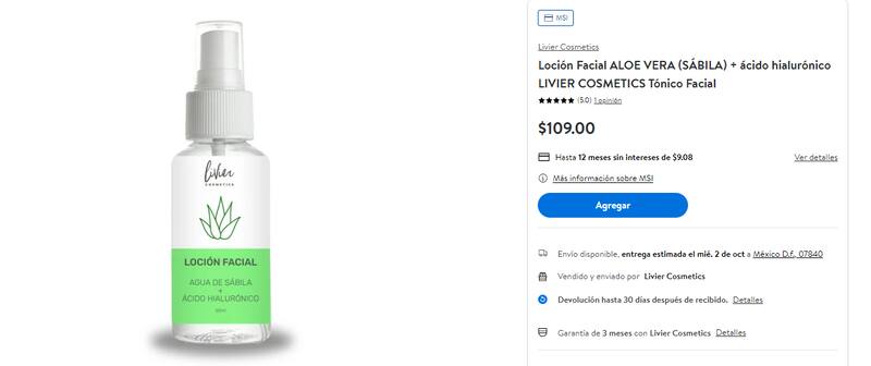 La loción facial Aloe vera (Sábila) + ácido hialurónico de Livier Cosmetics, disponible en Walmart, es una excelente opción para revitalizar la piel seca y dañada.