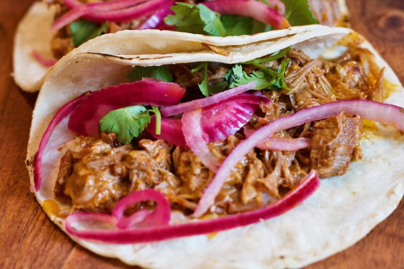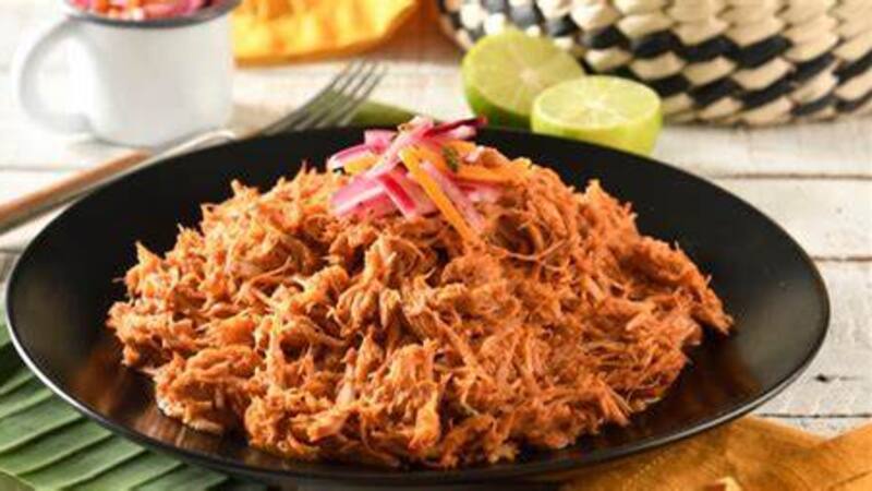 - Una vez lista la carne, cortar un trozo y desmenuzarlo. Servir junto a la salsa de achiote por encima y la marinada de cebolla. Decorar con el resto de la cebolla morada. ¡Y listo!
