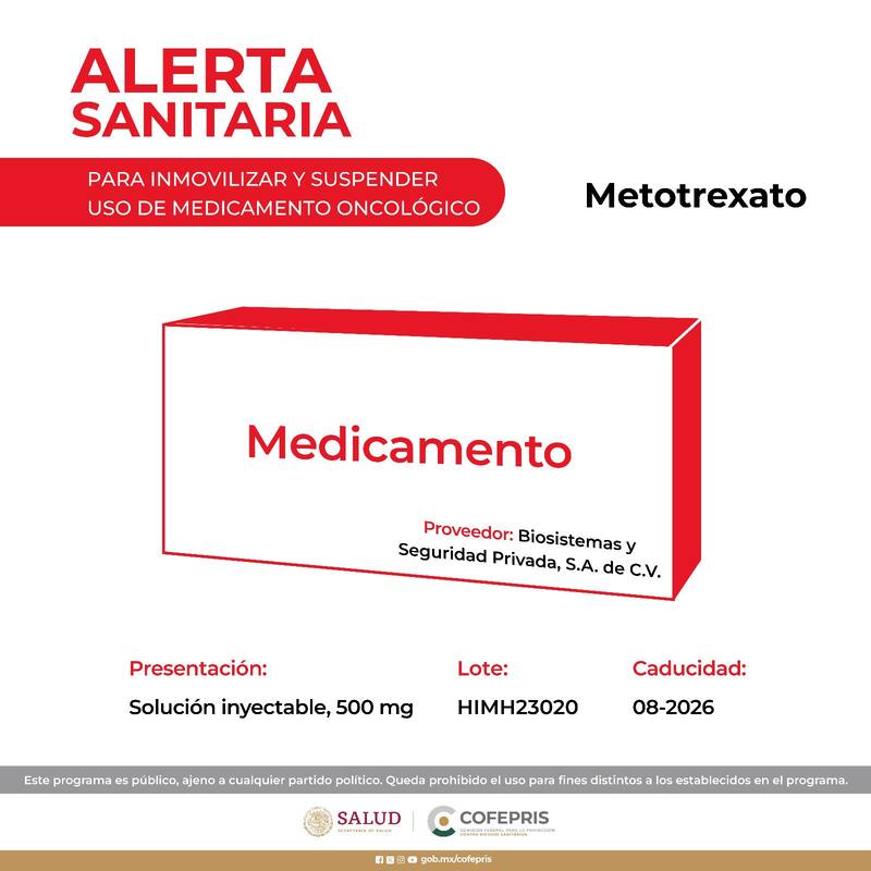 La Cofepris alerta sobre el metotrexato solución inyectable 500 mg de Biosistemas y Seguridad Privada en Ciudad de México.