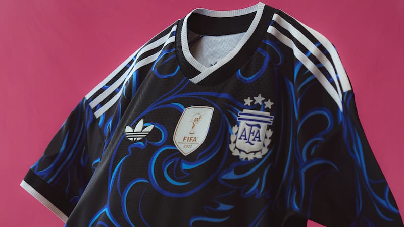 La camiseta luce el escudo de la Asociación del Fútbol Argentino con sus tres estrellas y el parche de Campeón de la Copa Mundial de la FIFA 2022, además del trifolio de adidas Originals. En la parte dorsal del cuello se incorpora un logo con la inscripción “Argentina” y el Sol de Mayo.