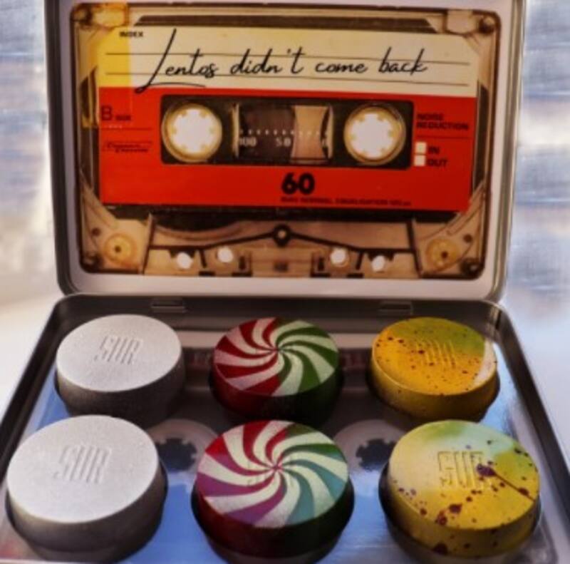 Vienen en lo que Forbes UK describe como 'un toque encantador' y que es un valor agregado muy pensado por los dueños de Sur. Una lata en forma de 'walkman' que además de los alfajores trae dos playlist con lentos argentinos e internacionales para celebrar el amor.