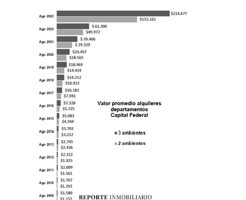 Así, el alquiler de un departamento de tres ambientes en Capital Federal tiene un precio promedio de $ 214.677 por mes, según los datos relevados por Reporte Inmobiliario. En agosto del año pasado, ese valor era de $ 61.300. El incremento duplica la inflación que mide el Indec, que en el último año alcanza un alza del 124 por ciento.