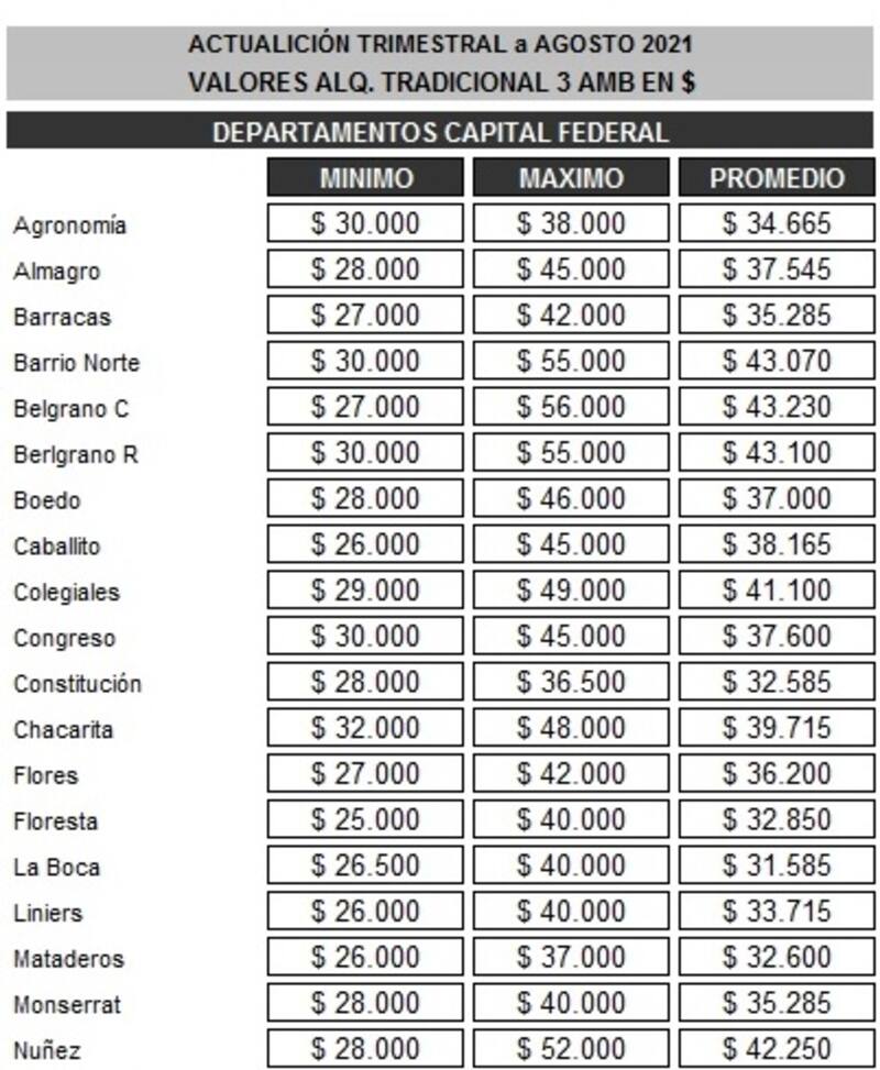 El valor medio de toda la ciudad para departamentos de 2 ambientes usados supero en agosto de 2021 los $ 29.329, mientras que las unidades de 3 ambientes cotizan en promedio por encima de los $ 39.400.