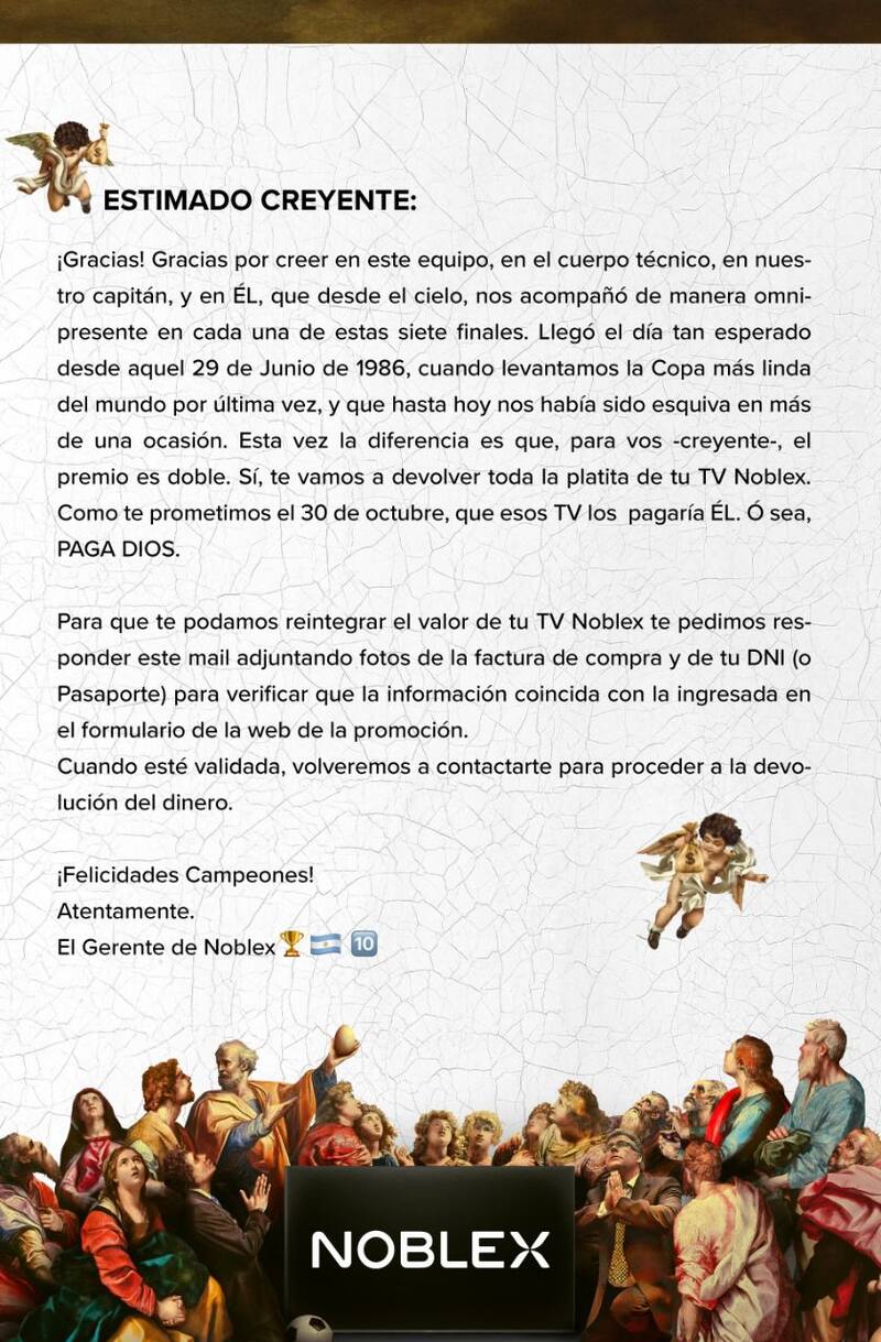 La acción que lanzó Noblex, sponsor de la Selección, fue una de las que mayor notoriedad cobraron. La marca de televisores propiedad del grupo Newsan deberá cumplir con la promesa que hizo hace un mes y medio cuando, en el marco de su promoción 'Paga Dios', anunció que quienes compraran un televisor de 65 o 75 pulgadas de alta gama el 30 de octubre (el día del cumpleaños de Diego Maradona) recibirían la devolución de su dinero en caso de que la Argentina resultara ganador del Mundial.