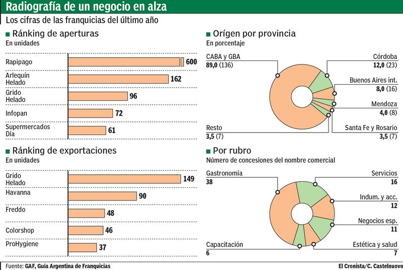 Entre las franquicias que más crecieron el año pasado, según la AAMF, están Rapipago (600 aperturas); Arlequín Helado (162), Grido (96) e Infopan, un emprendimiento surgido en 2002, que imprime avisos comerciales en las bolsas de plástico que se entregan en panaderías, y logró reemplazar el uso de 16.000 bolsas de plástico en cinco años.