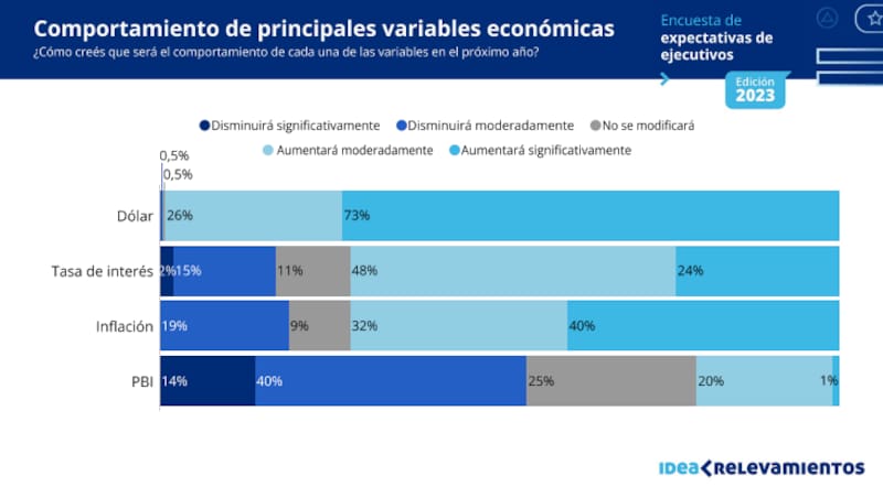 A su vez, los empresarios opinaron sobre una variable económica clave: el PBI. Al igual que las proyecciones para este año -a causa de la sequía se espera que caiga entre un 2,5% y un 3%-, el 40% de los encuestados indicó que en 2024 también disminuirá, aunque moderadamente.