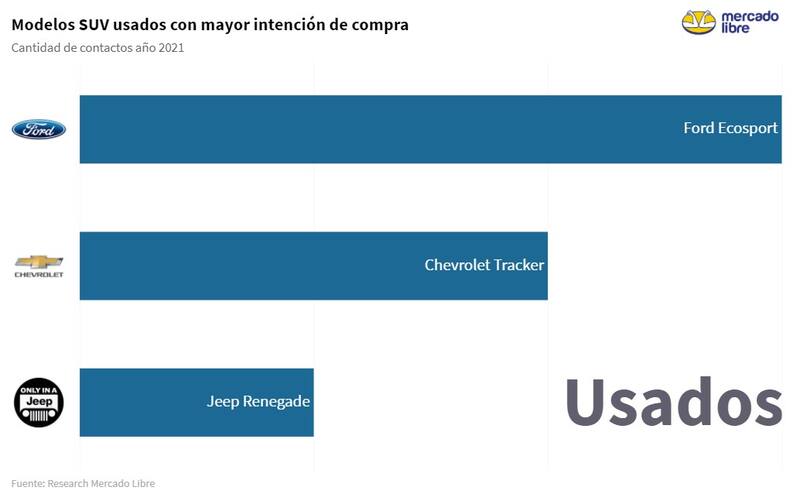 Según un minucioso estudio realizado por Mercado Libre de acuerdo al desarrollo de sus anuncios, dividido entre el mercado de vehículos nuevos y usados; Ford Ecosport, Chevrolet Tracker y Jeep Renegade son los tres SUV de segunda mano favoritos entre los argentinos hoy.