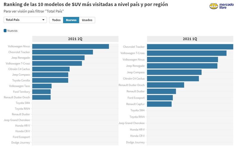 En cuanto a marcas, Para SUV usados, la más buscada para Mercado Libre es Ford, le sigue Jeep en segundo puesto y Toyota en el tercero. Mientras que en 0km la maca favorita es Volkswagen, seguida por Jeep y Chevrolet.