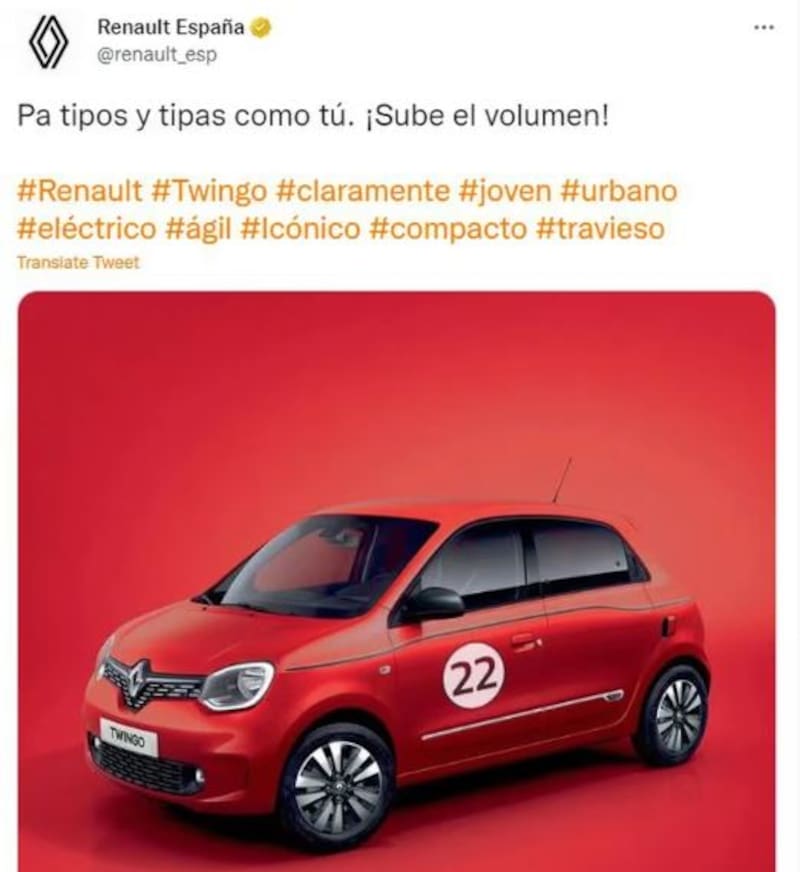 Renault también respondió con ironías al éxito del momento. "Pa tipos y tipas como tú. ¡Sube el volumen!", dice el tuit que publicó la automotriz en España. Una foto de la versión eléctrica actual del Twingo, rojo pasión,con el número ¡22!estampado en la puerta, ilustra la publicación. A su vez, incluyó tags polémicos como #claramente #joven y #travieso, entre otros.