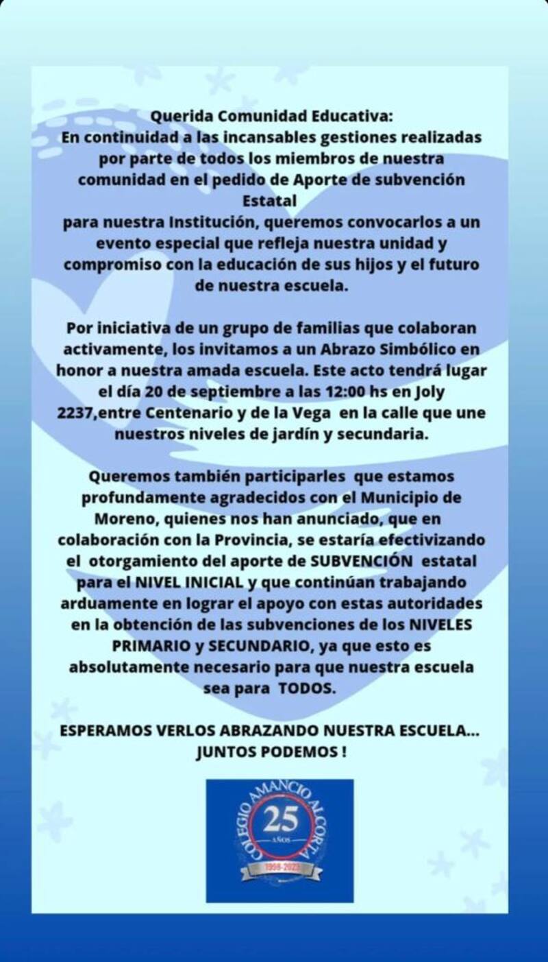 A su vez, este miércoles al mediodía, el colegio primario y secundario Amancio Alcorta, de Moreno, hará un 'abrazo solidario'. "Querida comunidad educativa: en continuidad a las incansables gestiones realizadas en el pedido de aporte de subvención estatal para la institución, queremos convocarlos a un evento especial que refleja nuestra unidad y compromiso con la educación de sus hijos y el futuro de nuestra escuela", comienza el texto de la invitación que la entidad le acercó a los padres.
