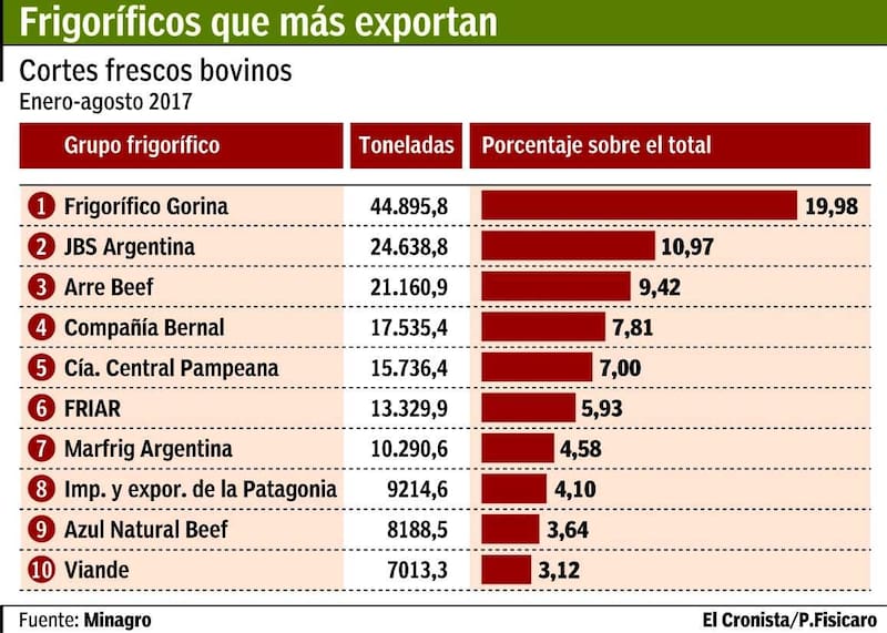 Junto con Compañía Bernal (17.535,4 toneladas) y Compañía Central Pampeana (15.736,4 toneladas), estos cinco establecimientos concentran más de la mitad de las exportaciones. Pero, también entre los 10 primeros lugares del listado se encuentran establecimientos de renombre como el del frigorífico Friar, perteneciente al grupo cerealero Vicentín (con unas 13.329,9 toneladas exportadas) o el de Marfrig (de origen también brasileño), con un total de 10.290,6 toneladas.