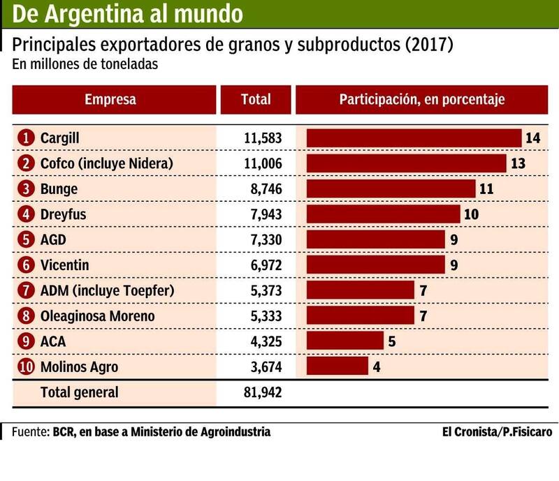 En el listado, luego de estas tres primeras firmas se ubicaron Dreyfus, con 7,9 millones de toneladas, Aceitera General Deheza (AGD), con 7,3 millones y Vicentín, con 6,9 millones. Estas últimas dos compañías fueron las de mayor volumen exportado en el segmento de harinas (subproductos), básicamente de soja, con 4,9 y 4,5 millones de toneladas respectivamente, y las primeras dos compañías de capitales argentinos. ADM (que incluye las operaciones de Toepfer), Oleaginosa Moreno (Glencore) y Molinos Agro también se metieron en el top ten.