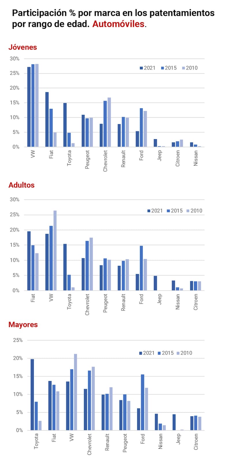 Entre los adultos se mantiene la regularidad de Fiat, Toyota y Jeep ganando espacio, a los que también se suma Nissan.