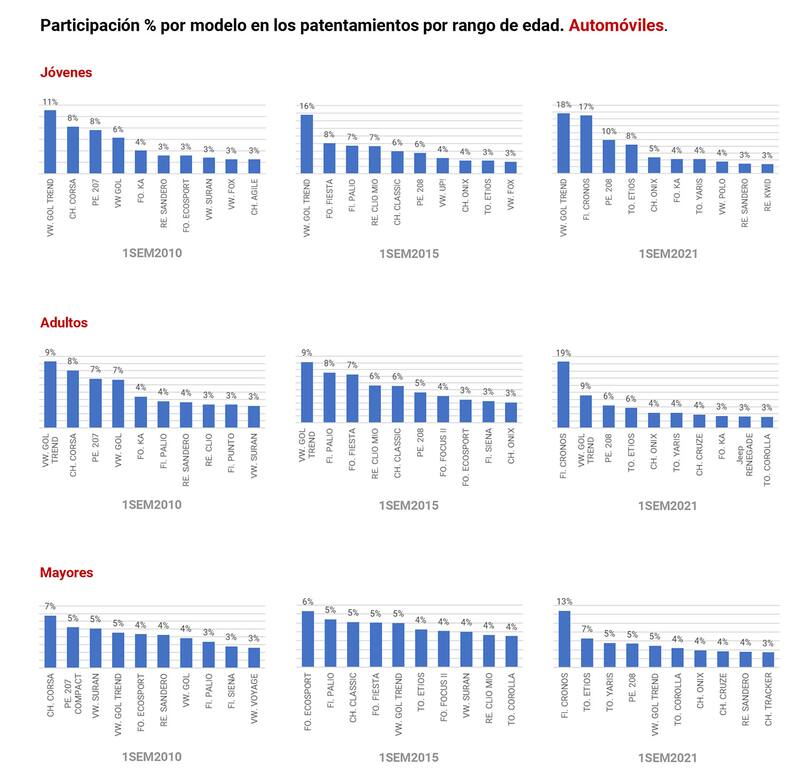 En el análisis por modelo de acuerdo a la edad, los vehículos de entrada, como el Gol Trend, Corsa, 207/208, Palio o Etios son los que lideran en todos los segmentos. Además, se observa también cómo el Fiat Cronos está irrumpiendo en todos los segmentos a partir de mantenerse en el top de ventas.