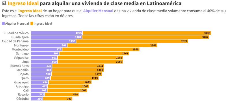 El informe que realiza Properati compara el sueldo mínimo y los precios de los alquileres en Latinoamérica. Un salario mínimo no alcanza para rentar una vivienda de clase media en 16 de las 17 ciudades analizadas.