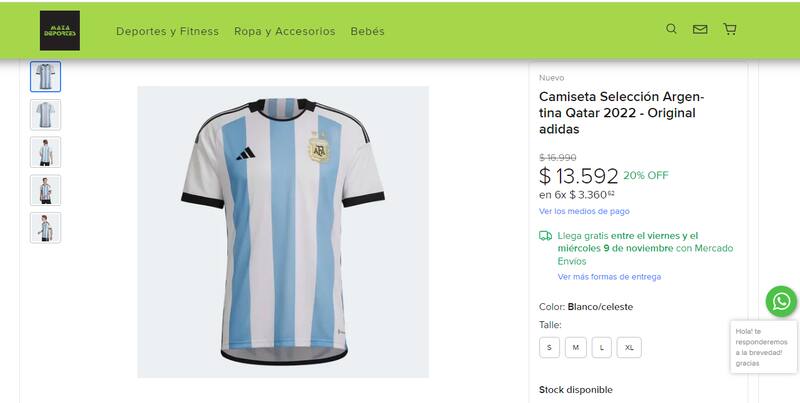 A pocos días del inicio del Mundial Qatar 2022, la camiseta de argentina es claramente una de las más solicitadas en este evento online. Se encuentra a $ 13.592 y se puede abonar con tarjeta de crédito en hasta 3 o 6 cuotas sin interés con estos bancos: