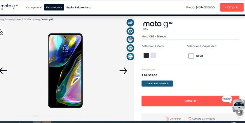 Motorola pone en venta este modelo de celular a $ 85.000. Se puede abonar en hasta 24 cuotas sin interés, con el BAPRO. Con un almacenamiento de 128 GB, una pantalla de 6.55" y un sistema operativo Android 12, este tanque se encuentra entre los más demandados por los usuarios de Cyber Monday.