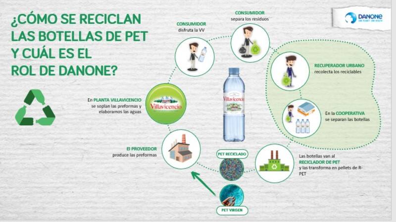 En la Argentina,las cooperativas de Fundación Avina se encargan de recuperar el PET. Luego, dos firmas proveedoras tienen a cargo la desintegración de este material. Por último, Danone recibe la 'preforma' para fabricar el envase de la botella final en su planta de Mendoza.