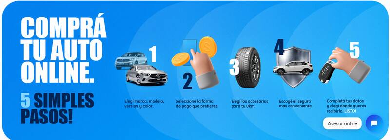Las marcas disponibles ya para comprar en el sitio para autos y vehículos comerciales son: Volkswagen, Jeep, Ram y Mercedes-Benz (autos, van, camiones).