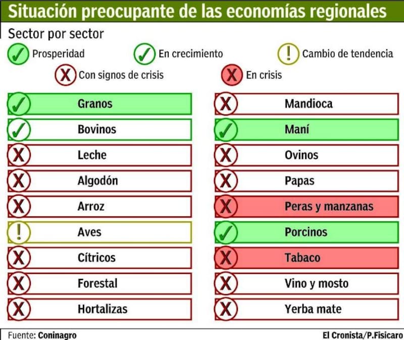El cuadro de situación de 18 economías regionales en el país no vislumbra un panorama alentador. De todos los sectores, sólo cuatro presentan condiciones de "prosperidad" o de "crecimiento". Entre ellas se incluyen la producción de granos y la actividad ganadera (producción de bovinos y porcinos), a la que hay que sumar la producción de maní, como las cuatro economías regionales que están en alza.
