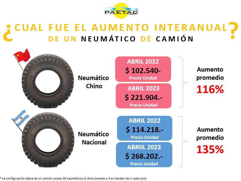 En abril de 2022, dice, el precio de los neumáticos chinos por unidad era de $102.540, mientras que hoy su precio ascendió a $221.904, sumando un aumento del 116%.