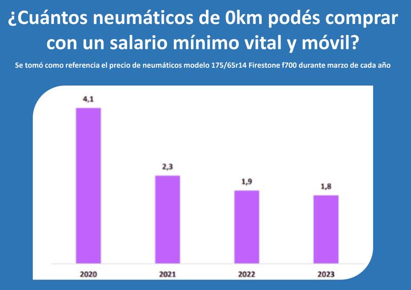 Según un estudio de Focus Market en base a datos de PAETAC (Primera Asociación Empresaria de Transporte de Cargas), un neumático para autos de pasajeros costaba en $16.875 el año pasado mientras que hoy parte de los $69.500. El golpe para los consumidores es mayor si se tiene en cuenta que mientras en 2020 con un salario mínimo se compraban 4,1 neumáticos, hoy solo se adquieren 1,8 neumáticos.