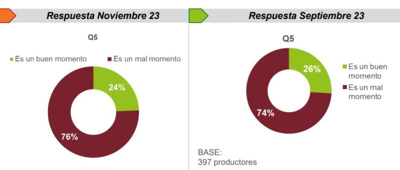 En tanto, la situación financiera actual de los productores también es negativa. A pesar de que el estudio relevó una mejora respecto a la medición de septiembre de 2023, el 67% de los productores manifestó que su situación financiera es peor que la de un año atrás. Si se compara este Índice en términos interanuales, la situación es similar a la de noviembre 2022 (45 vs 44).