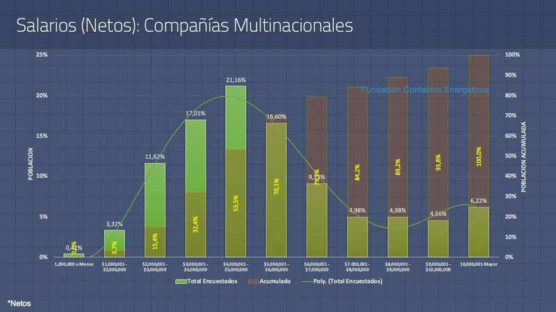 El relevamiento se realizó entre colaboradores de empresas operadoras, de servicios especiales, otros servicios, equipos y herramientas, servicios de torre, consultoría y hasta dependencias del Estado nacional y provincial, en tanto que por cargos incluyó junior, semi senior, senior, gerencia y dirección y C-Level.