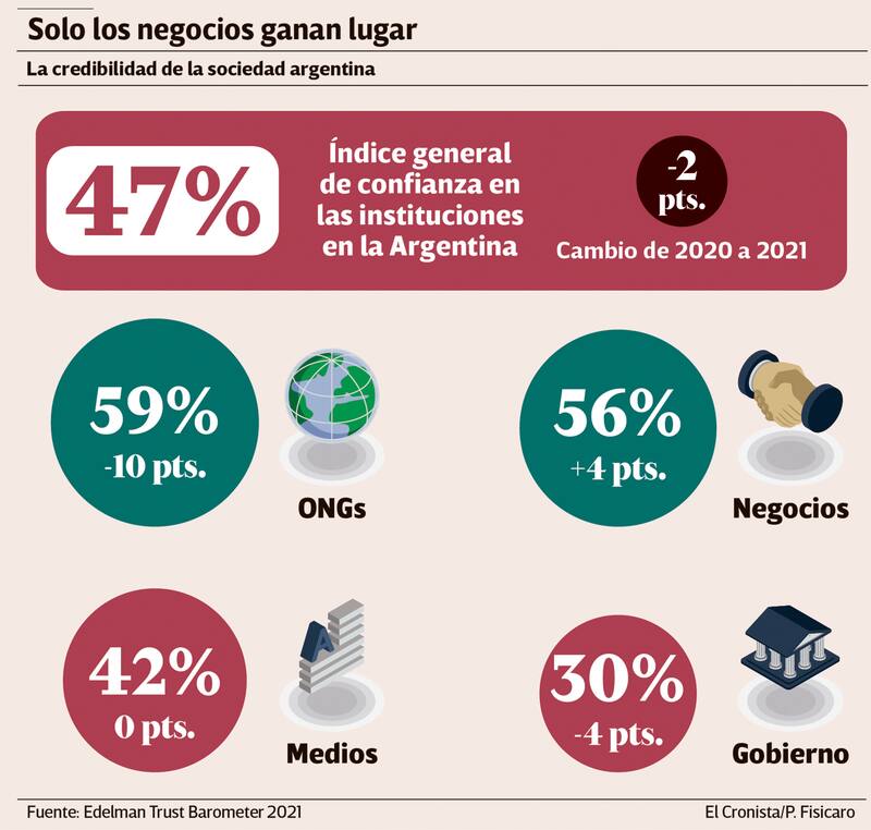 La pandemia puso a prueba el nivel de confianza en las instituciones de la Argentina, donde el índice llega a apenas el 47%. A un año del inicio del brote del coronavirus, las empresas son las únicas que a nivel local mejoraron en la comparación interanual. Así lo asegura la edición 2021 del estudio Edelman Trust Barometer.