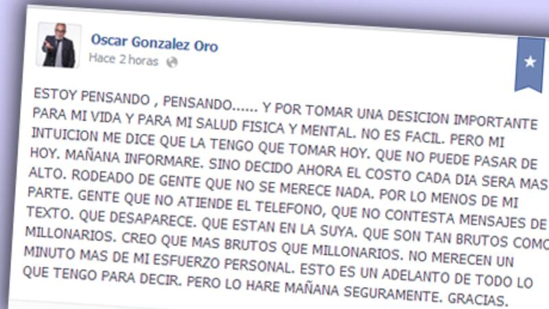 El periodista Oscar González Oro, conductor del popular ciclo radial "El oro y el moro" en Radio 10, publicó un mensaje en su cuenta de Facebook que alimentó versiones sobre una renuncia a su puesto, luego de 15 años al frente de la emisión radial.