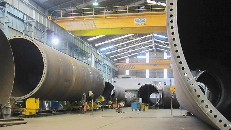 Las torres no son un detalle en la infraestructura de un generador eólico. Sobre ellas descansa la góndola (cabina), las aspas (de 40 metros) y toda la tecnología que lleva un molino de viento. Cada una mide 85 metros de altura, 4 de diámetro y pesa 185 toneladas. Para transportarlas, hay que dividirlas en cuatro tramos de 25 metros y 60 toneladas de peso por unidad.