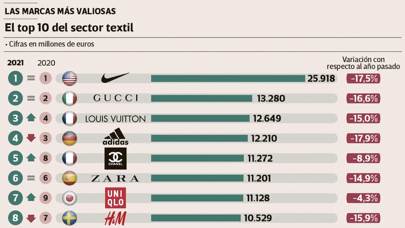 El ranking del sector textil recoge marcas de diversos subsectores: lujo; ropa deportiva; moda rápida; relojes, accesorios y joyas; diseñador callejero; ropa interior; y calzado. De todos esos, el calzado es el único que registró un aumento en el valor de la marca año tras año, un 9% de media de crecimiento.