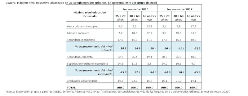 El 85,8% de los jóvenes de entre 25 y 29 años de edad no logró avanzar más allá del nivel educativo secundario y los graduados universitarios se redujo a solo un 14,2% de los estudiantes.