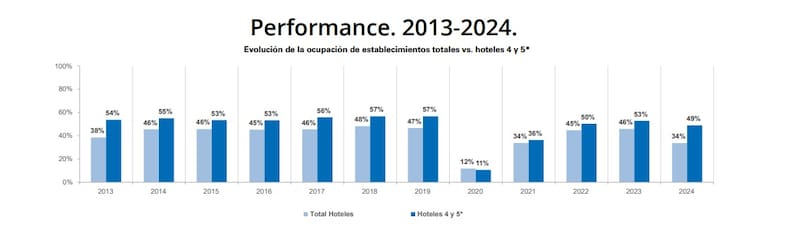 Ahora bien, la ocupación de este tipo de hoteles, registra hasta septiembre 2024 un promedio del 49%. Por debajo de 2022 y 2023 cuando esos números fueron del 53 y 50% respectivamente. Sin embargo los números son superiores a los hoteles de uno, dos y tres estrellas donde el promedio de ocupación apenas alcanza el 35 por ciento.