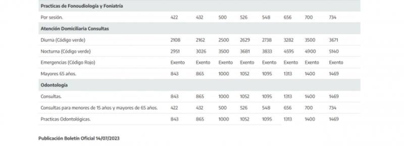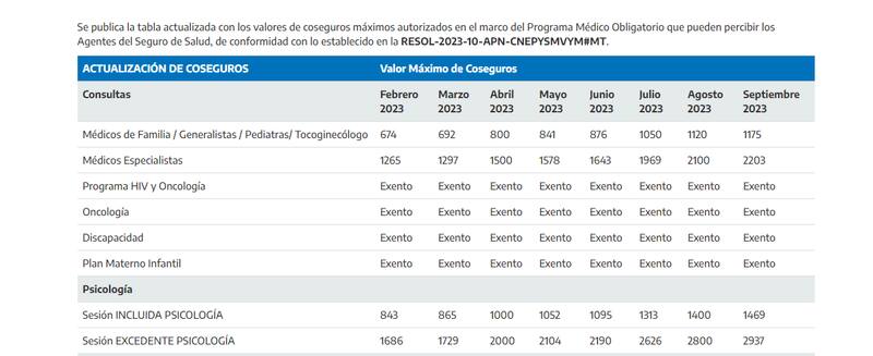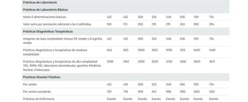 Las entidades avaladas para el cobro deben presentar a las autoridades no solo la descripción de los planes con los copagos ofrecidos, sino también los cuadros tarifarios con los detalles de los valores para cada prestación. Estos son los montos vigentes: