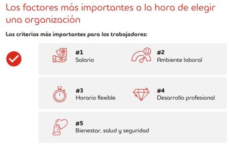 Según el estudio, la remuneración salarial sigue siendo el aspecto más influyente en los trabajadores a la hora de elegir un empleo y quedarse en él, con el 53% de las ponderaciones. Le siguen el ambiente laboral del lugar en el que se desempeñan y su flexibilidad (con el 36% de las consideraciones) y las posibilidades de desarrollo profesional que ofrece (con el 25%).