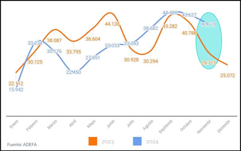 De esta manera, en el acumulado de enero a noviembre de 2024, las automotrices produjeron 468.553 vehículos, es decir, 105.189 unidades menos que en el mismo período del 2023 . Esto representa una baja del 18,3%.