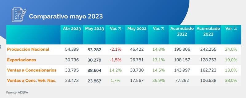 El informe de Adefa arrojó que en mayo, el sector comercializó a la red de concesionarios 38.604 vehículos, un 14,5% por sobre el volumen de mayo 2022 y un 14,2% más respecto de las entregas de abril.