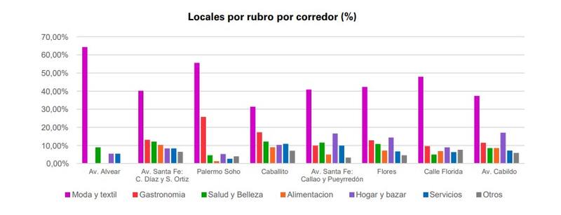 Este sector es especialmente fuerte en áreas como Av. Alvear, donde representa el 78% de los locales, y Palermo Soho, donde también predomina junto con la gastronomía.