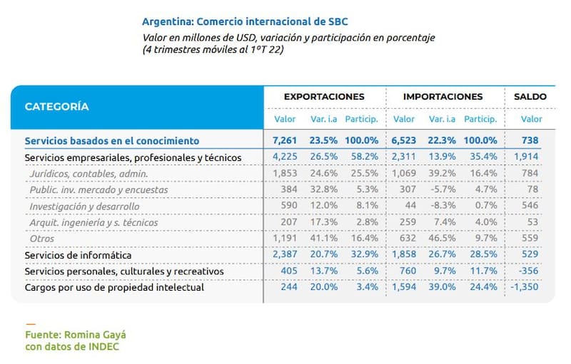 La economía del conocimiento sigue creciendo en la Argentina. Las exportaciones del sector sumaron u$s 7261 millones en total y aumentaron un 23,5% en el primer semestre comparado con los primeros seis meses de 2021, con los servicios profesionales de abogados, contadores e ingenieros a la cabeza.