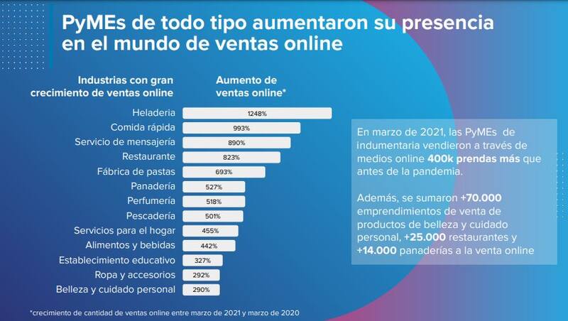 Además, prácticamente se triplicó la cantidad de actividades que se sumaron a la transformación digital.Pasaron de 200.000 en marzo de 2020 a 590.000 en el mismo mes de 2021. Se sumaron 70.000 emprendimientos de venta de productos de belleza y cuidado personal, 25.000 restaurantes y 14.000 panaderías a la venta por Internet.