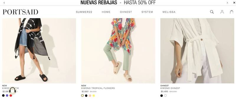 Portsaid ofrece una amplia variedad de pantalones un 50% rebajados y más de 50 ítems con descuentos. Un mono que antes estaba $ 9650 hoy sale $ 7720 y un kimono que valía $ 10.990 se encuentra a $ 5495.