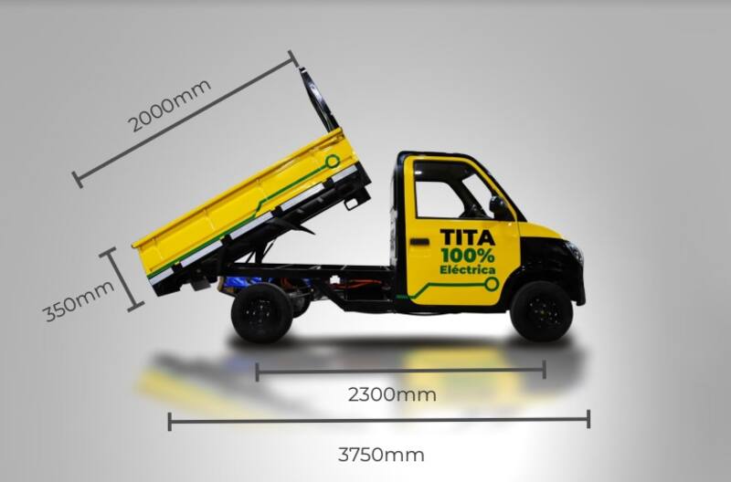 Tita, al igual que su antecesor, tiene espacio para dos personas. Su tamaño es de 3.75m de largo; 1.37 m de ancho y 1.72 m de alto. La caja mide 2000 x 131 x 350 mm, es abierta, volcadora, con barandas rebatibles de los tres lados.