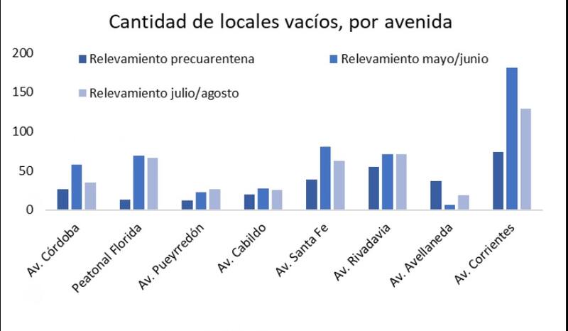 En números, mientras en el bimestre pasado se habían contabilizado 514 locales vacíos, en el último informe se detectaron un total de 433 locales en venta, alquiler o cerrados en las áreas relevadas.