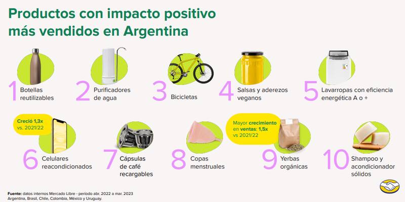 Al igual que el año pasado, en todos los países el término más buscado fue "bicicleta". Estas, asimismo, estuvieron en el top 5 de artículos con impacto positivo más vendidos a nivel nacional, junto a las botellas reutilizables, los purificadores de agua, las salsas y aderezos veganos, y los lavarropas con eficiencia A o +. El producto que más creció en ventas en el país fue la yerba orgánica, con un incremento del 50% respecto al año previo.