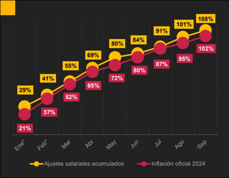 El incremento salarial entre enero y septiembre de este año fue, según las compañías consultadas, del 108%. Por lo que, le ganó por seis puntos porcentuales a la inflación acumulada en el mismo periodo, que fue del 102 por ciento.