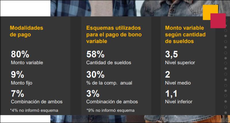 En el reporte se observó que el 87% de las empresas consultadas paga bonos a su personal. Al desmenuzarse esta cifra promedio, el 98% de las organizaciones entrega bonos a los empleados de nivel superior, el 88% de nivel medio y el 69% premia también a otras categorías.