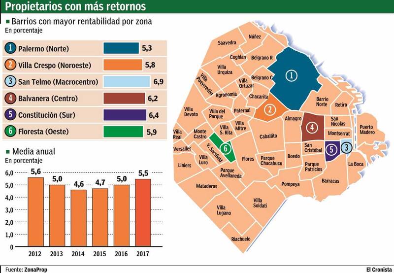 Otros de los barrios donde más alto es la rentabilidad son Balvanera (6,2%), Floresta (5,9%) y Villa Crespo (5,8%). La zona sur en general es donde se ubican los inmuebles con mayores retornos. Allí, todos superan la renta media de 5,5% de la Capital Federal. Es el caso de Parque Patricios (5,7%) o Boedo (6,3), entre otros.