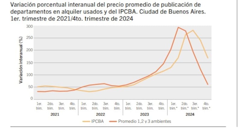 Según los datos relevados de la Ciudad, el incremento medio del valor de publicación de los alquileres de departamentos usados fue inferior a la variación estimada por el Índice de Precios al Consumidor de la Ciudad de Buenos Aires (IPC-BA) que entre octubre y diciembre promedió el 168,3% interanual.
